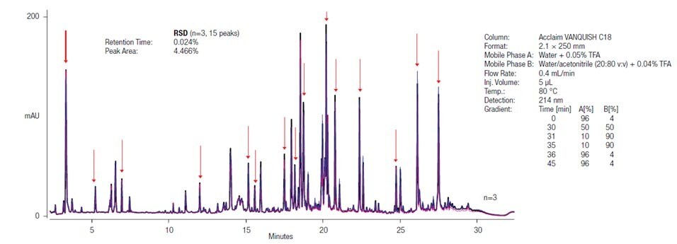 Le chromatogramme ci-dessous représente 3 chromatogrammes superposés du même anticorps monoclonal dont la digestion a été réalisée par 3 utilisateurs distincts, à 3 jours différents et avec un écart-type de reproductibilité (RSD) < 5 %.