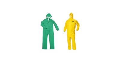 One-piece garments from chemical-resistant materials, protecting against liquid chemical splash, infective agents, radioactive contamination, and static electricity.
